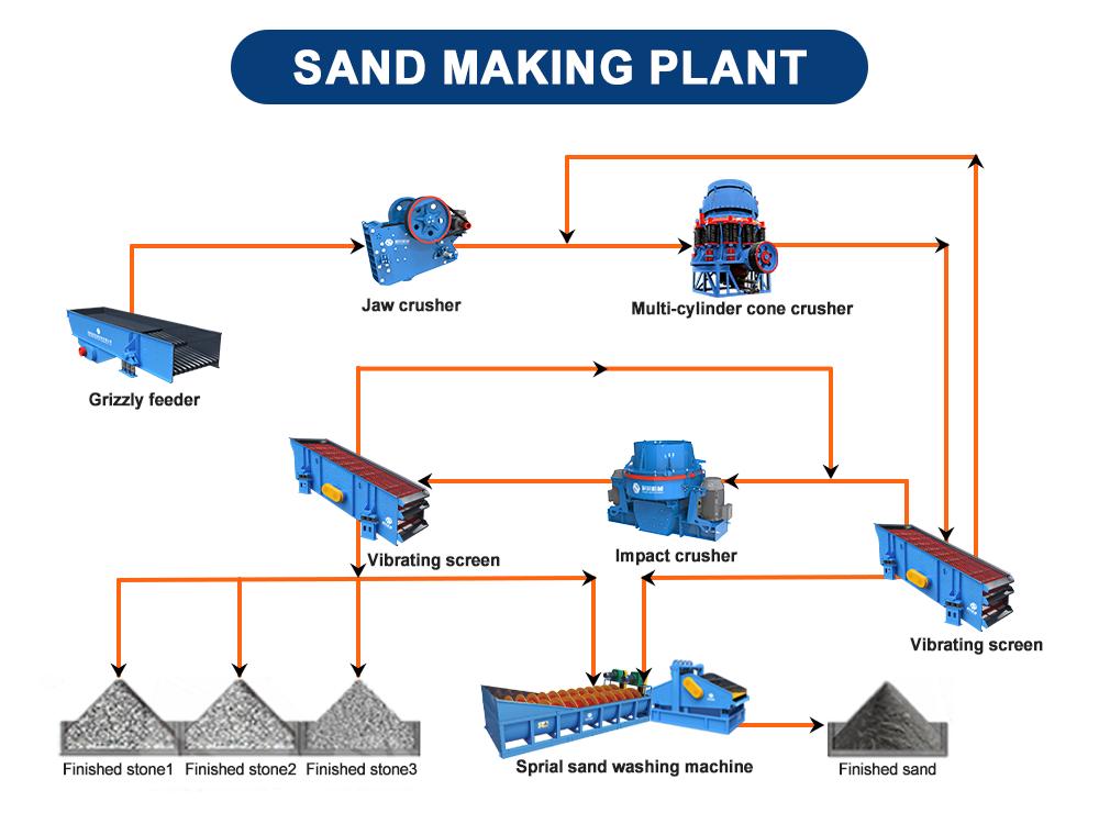 В состав оборудования завода по производству искусственного песка входят вибрационный питатель, дробилка крупного, среднего и мелкого помола, вибрационный грохот, машина для производства песка, ленточный конвейер. Питатели, вибрационные грохоты и конвейеры являются вспомогательным оборудованием.На заводе по производству песка природные породы, известняк, гранит, песчаник, речная галька и другие материалы могут быть переработаны в искусственный песок, который соответствует требованиям, предъявляемым к строительному песку.Он предназначен для замены натурального речного песка в зданиях и строительной промышленности, которые нуждаются в высококачественных заполнителях.